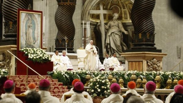 ♦教宗方济各12月12日下午在圣伯多禄大殿主持瓜达卢佩圣母庆日弥撒,他在讲道中反思了圣母玛利亚的三个特质:女性、母亲和“混血儿”。教宗解释到:玛利亚是最杰出的女性,因为她是她圣子的门徒。虽然各个时代的基督徒给玛利亚冠以许多荣衔来尊敬她,但却没有提到她作为女性门徒这一点。玛利亚对她的导师、她的儿子、唯一的救赎者谦卑而忠信。作为母亲的玛利亚从未向她的儿子索取任何的东西,她从未以“共同救赎者”自居。她不仅是我们的母亲、教会的母亲,也是教会的图像。因此,少了这一层女性的幅度,我们无法想像教会的模样,这对于理解妇女在教会中的角色至关重要,仅从职能了解妇女的角色是不完整的。 我们的母亲玛利亚以“混血女性的模样”显现给她的子民。表明她是所有人的母亲。以慈母温柔的情怀与我们每一位交谈。教宗最后总结道,玛利亚以一个“混血女性”的形象显示给人类,为的是让我们明白她的圣子也是“混血儿”,意即:祂是真天主也是真人。(梵蒂冈新闻网)