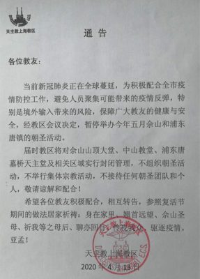 4月13日,上海教区发布通告表示,因新冠肺炎疫情防控需要,暂停今年5月佘山和浦东唐镇的朝圣活动。届时,教区将对佘山山顶大殿、中山教堂、浦东唐墓桥天主堂及相关区域实行封闭管理,不组织朝圣活动,不举行集体宗教活动,不接待任何朝圣团队和个人。最后,通告呼吁信友居家祈祷,并祈求佘山圣母的护佑。(上海教区网站)