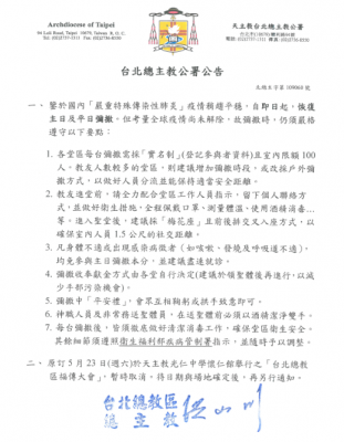 5月4日,台北总主教公署发布公告,表示因疫情趋于稳定,自当日起,恢复该教区平日及主日弥撒。