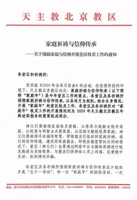 通知要求各堂区及各祈祷所围绕家庭祈祷与信仰传承至少组织开展“五个一活动”,即一次“家庭年”的团体活动、一次宗座劝谕《爱的喜乐》或《家庭团体》的学习活动,一次敬礼圣母的祈祷活动、一次家庭祈祷的分享活动、一次信仰传承的经验交流活动。(北京教区网站)
