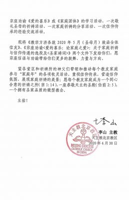 4月30日,北京教区发布了一份通知,表示教区决定以圣母月为契机,自2020年5月1日-12月31日,成立“家庭年”,鼓励每一位基督徒在家庭中活出基督的信仰。