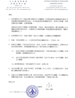 5月22日,香港教区主教公署秘书长办公处发表公告表示,香港教区各教堂将于6月1日起恢复公开平日弥撒,6月7日起恢复公开主日弥撒。