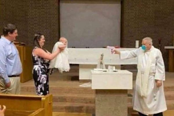 近日,一张神父用水枪给婴儿“施洗”的图片在网上广为流传。图片中,一婴儿被母亲举着,父亲侍立在旁,而一位神父远远站着,用水枪朝婴儿所在的方向喷水,看起来就像是一个给婴儿付洗的场面。