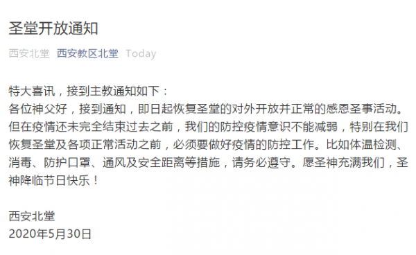 5月30日,西安教区北堂微信公众号发表了一则圣堂开放通知,在通知中,西安教区主教告知各位神父,即日起恢复该教区圣堂的对外开放并正常举行感恩圣事活动。主教在通知中叮嘱信众遵守相关防疫措施,如:体温检测、消毒、佩戴口罩、保持通风及安全距离等。最后,主教祝大家圣神降临节快乐。
