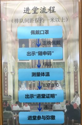 据悉,各教堂每场弥撒的参礼人数不得超过教堂可容纳人数的30%。上述宣布恢复公开弥撒的堂区也都在公告中对信友的进堂方式提出了具体要求,例如:体温不超过37.3℃、全程佩戴口罩、出示上海地区健康码“随申码”等。