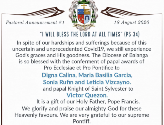 据LICAS新闻网消息,近日,菲律宾巴丹省巴朗牙教区主教桑托斯(Ruperto Santos)发布公告表示,该教区有5人获得圣座奖章及勋章。其中,有四位(Digna Calina、Maria Basilia Garcia、Sonia Rufin、Leticia Vizcayno)获得为教会与教宗服务奖章,还有一位(Victor Quezon)获得圣西尔维斯特罗教宗爵士勋章。