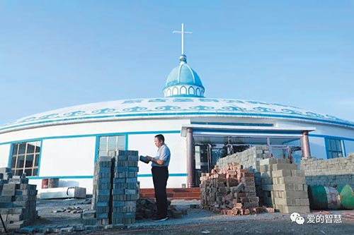 该教堂于2015年4月30日举行建堂奠基仪式,在本堂杨福喜神父的带领下,当地教友共捐款20多万,历时三年零四个月,终于落成,这座造型独特蒙古包样式的教堂,是内蒙古最具民族特色的一座美丽的圣母大殿,蒙古圣母是该圣堂的主保。(信德网)
