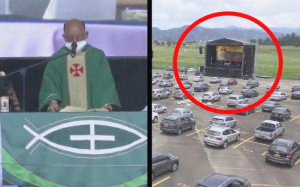 近日,哥伦比亚阿亚拉(Luis Carlos Ayala)神父,在首都波哥大附近的一个露天汽车影院内举行弥撒,有数百位信友在各自的汽车内全程参与。阿亚拉神父在搭建的舞台上主持弥撒圣祭,而其背后的巨大荧幕则直播他的弥撒过程。到领圣体仪式时,他走到每一辆车前,为信友分发圣体。
