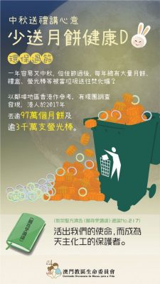近日,澳门教区生命委员会便以此为例,呼吁人们少送月饼、环保过节。该委员会在社交媒体上,邀请人们为保护环境出一分力,齐来回收中秋月饼礼盒,并成为天主化工的保护者。