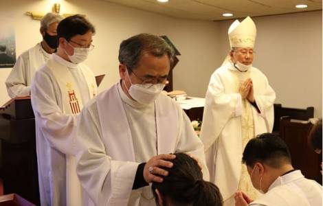 据信仰通讯社报道,近日,首尔总教区辅理主教具耀飞(구요비)为这6位司铎举行了隆重的派遣礼。具耀飞主教在派遣礼中,感谢司铎们在新冠疫情艰难时刻,回应了天主对他们传教的召叫。在场主教们也纷纷为即将启程的司铎们行傅手礼,鼓励他们热心祈祷、永远坚信天主。