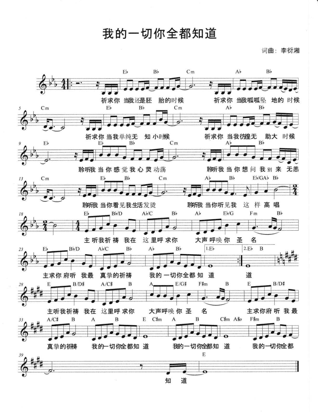 《我的一切祢全都知道》:创作者透过歌词和音乐描述人们在生命的各个阶段向天主祈求和聆听的微妙关系,经过生命起始的胚胎、出生和成长的各阶段,天主是生命唯一的祈求对象和聆听者。词曲忠实地表达了他的祈祷、期待和呼求,而最后的一句「我的一切你都知道」表达了感恩和信赖,是一首触动人心的歌曲。