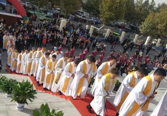 本台消息:今日,邯郸教区新主教座堂,一片喜庆,在南门里和曹庄的乐队演奏声中,迎来了启用以来第一次的司铎祝圣大典。礼仪由上午九时开始,经过主教府面前的丛台区丰收路,礼仪队伍缓缓进入主教府座堂。据邯郸教区办公室主任张神父介绍,此次祝圣典礼由邯郸教区助理主教孙继根主教主礼,来自于本教区和兄弟教区一百一十多位神父、五位执事、百余名修女以及新铎的家人朋友、周边堂区的教友千余人参与了这次盛典。