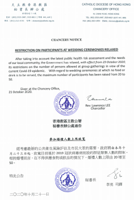 10月21日,香港教区主教公署秘书长办公处发布通告表示,综合政府防疫规定及市民大众的需要,自10月23日起,在不得供应食物或饮品的情况下,香港教区婚礼出席人数上限由20人增至50人。
