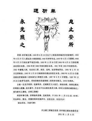 1月5日,陕西三原教区发表讣告称,该教区宗怀德荣休主教于当天晚上8点,安息主怀,享寿100岁。
