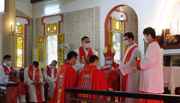 1月14日,江门教区在圣母圣心堂举行程三根、常江峰两位执事晋铎典礼,此次典礼严格按照疫情常态化管理要求进行。弥撒礼仪由江门教区梁建森主教主礼,9位神父共祭。江门教区圣母洁心修女会及教友们近100人共同参与了这神圣的礼仪。