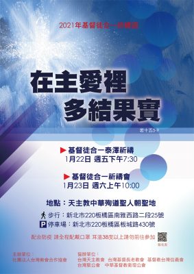2021年1月18日至1月25日是第54届基督徒合一祈祷周,全体基督徒应邀在这段时期为教会的修和与合一祈祷。为善度这一时期,台湾基督信仰教会将共同举办主题为“在主爱里,多结果实”的祈祷活动。