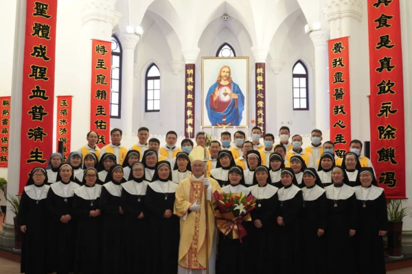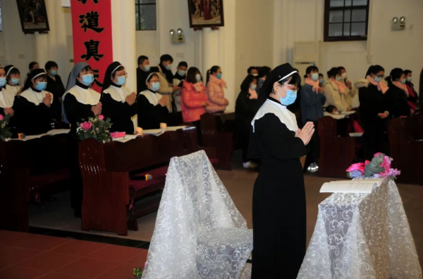 本台消息:1月23日,宁波教区拯灵会王依纳爵修女宣发终身圣愿,庆典弥撒在教区江北总堂隆重举行,由教区金仰科主教主礼。因疫情管控,只有拯灵会修女、王修女家人及少数教友参加了礼仪。