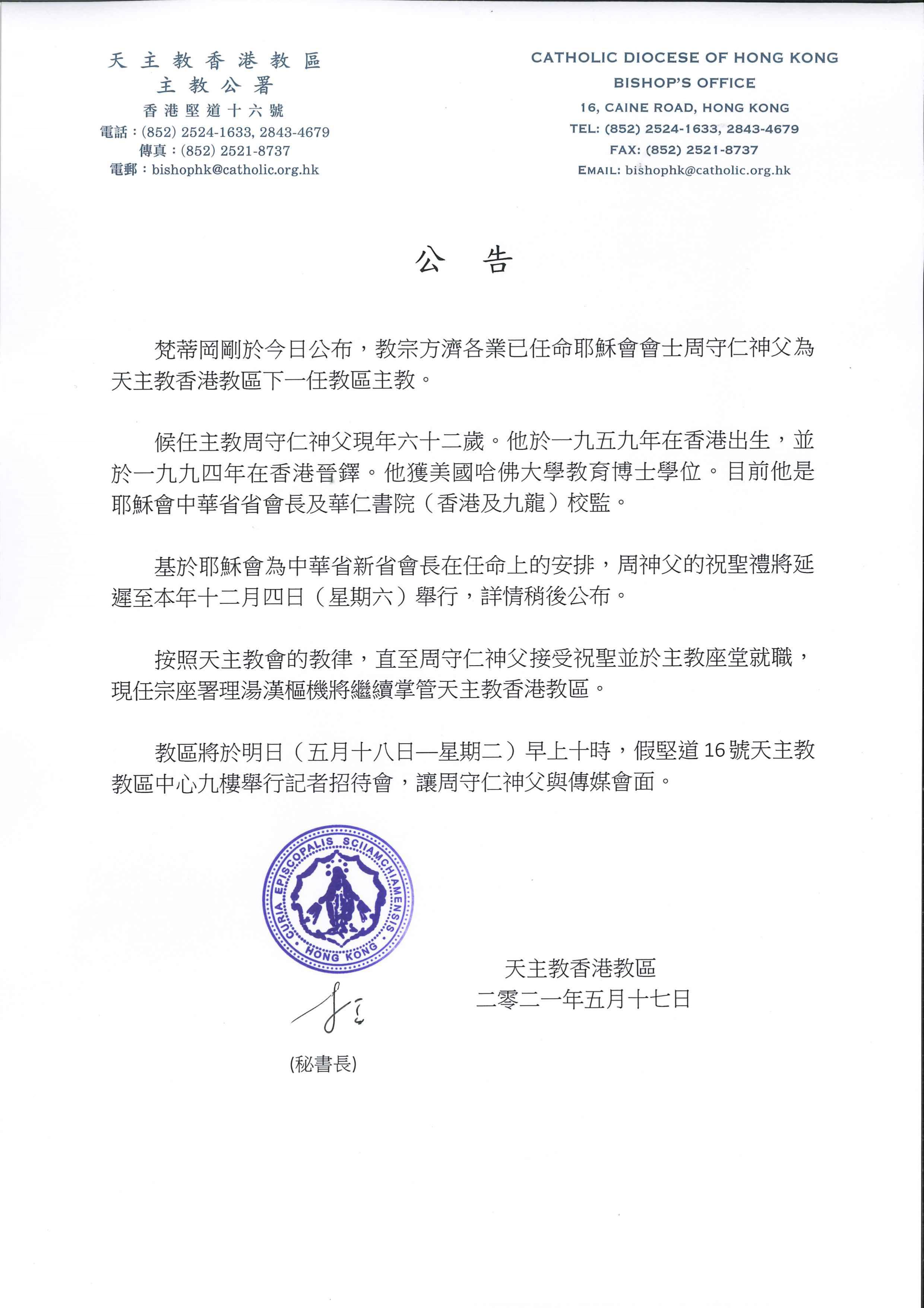 圣座新闻室于今天(5月17日)发布公告称,教宗方济各已任命耶稣会会士周守仁神父为香港教区主教。